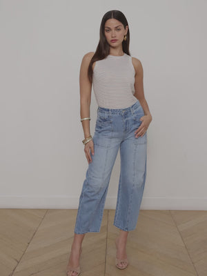 شيدت مع جوبان برميل برميل ، جين ، الذي تم إنشاؤه بملاءمة باردة وجيوب تصحيح جديدة ، في غسل خفيف باهت مع شعور عتيق.