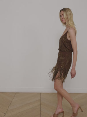 مصنوعة بشكل معقد مع مزيج من الماكينة والقراءة اليدوية ، يتطلب كل تنورة Eulla أكثر من 21 ساعة لإكمالها. مستويات الهامش من الخرز تضيف حركة قذيفة وسحر في عشرينيات القرن العشرين.
