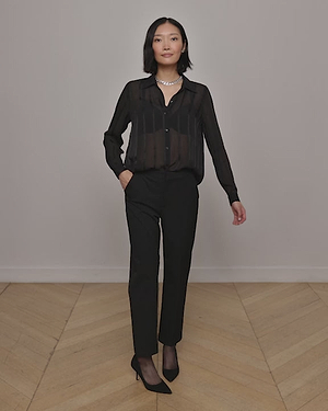 A woman with a bob haircut wears the Argo Silk Blouse—sheer, black, and button-down—paired with black pants and a chunky chain necklace, standing against a plain light gray background.