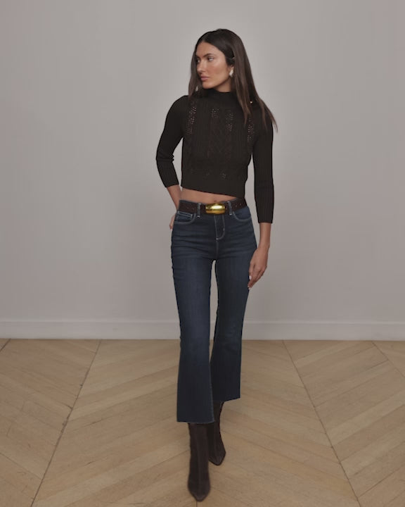 A woman with long dark hair poses confidently indoors wearing the L'AGENCE Kamdyn Cropped Sweater—a black cable knit pullover with gold shoulder buttons—paired with high-waisted flared blue jeans and brown ankle boots.