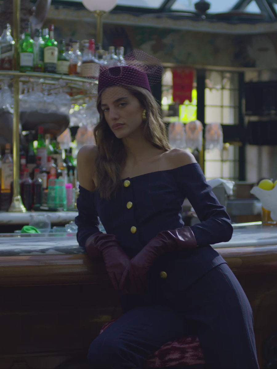 Tailored suiting takes a bold turn in the Alice, designed with an off-the-shoulder neckline that’s both striking and sleek. In deep navy with fine burgundy pinstripes, it's finished with bold gold buttons and a fitted silhouette. Pair with the coordinating pant for a statement look that redefines power dressing.