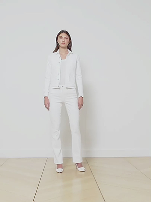 A lightly distressed, classic denim jacket with a relaxed fit in optic white. Crafted from premium stretch denim with a true denim feel. Celine features a small feminine collar, slimming angled seams, slit pockets, and a clean, finished hemline.