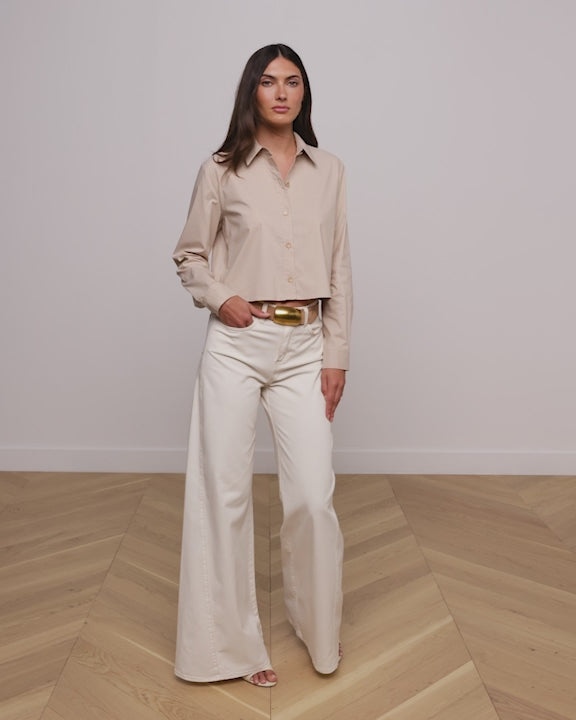 A classic tailored shirt with a cool, borrowed-from-the-boys fit and cropped high-low hem. Now back in neutral tan with a subtle pinstripe.