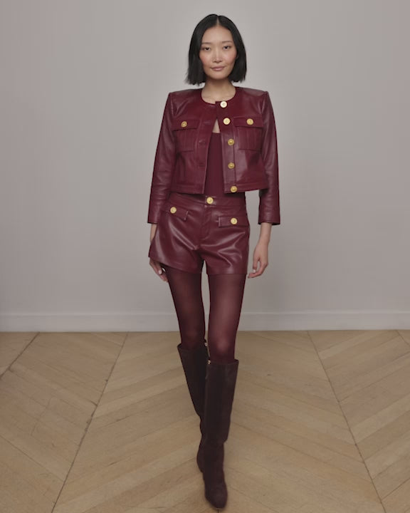 This style debuted at the Fall ‘25 NYFW presentation. Crafted from a supple, fine-grain leather and dyed a beautiful black cherry color, the Deidra is a sleek collarless jacket designed with a cool, cropped cut.