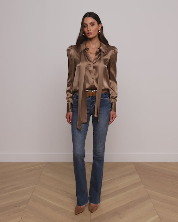 This style was featured in our Spring 2026 NYFW presentation, After Hours. The Honey blouse is a beautiful evolution of our signature silk shirt, designed with a romantic tie neck and hidden button placket for a sleek, sophisticated finish. Crafted from lightweight silk charmeuse with a brilliant shine and stunning drape, this year-round essential is back in light brown.