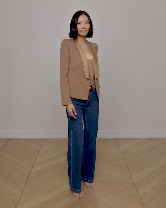 A sharp, timeless double-breasted blazer accented with a lustrous satin lapel. Now in a neutral tan.