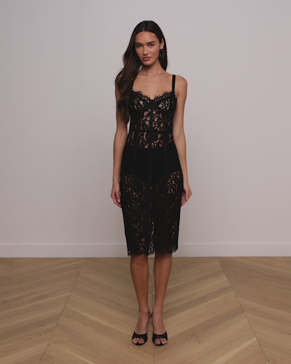 This style debuted in our Spring 2026 NYFW presentation, After Hours. Undeniably sexy and attention-grabbing, the Jennifer midi dress hugs the figure in sheer floral lace defined by grosgrain ribbon and underwire cups. Wear it with tonal undergarments for a look no one will forget.