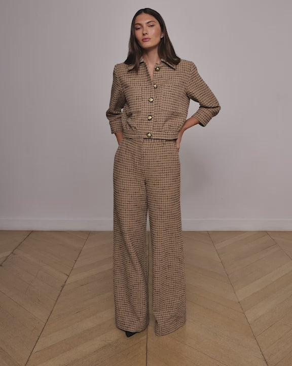A woman with long brown hair stands by a plain wall in the Jia Cropped Tweed Jacket, featuring brown and beige textured tweed, large buttons, and wide-leg trousers, with one hand in her pocket.