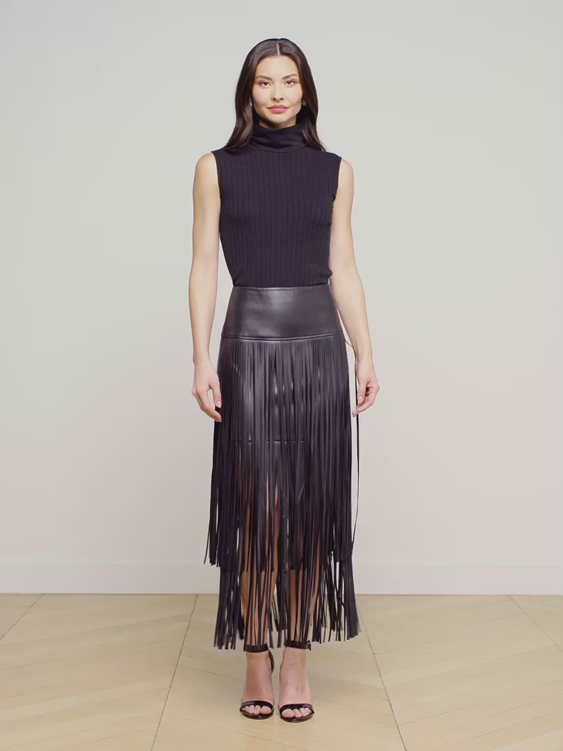 Our newest vegan-leather skirt, updated with extra-long fringe. The Karolina slim-fit miniskirt beguiles with two tiers of fringe that fall to lower calf and offer the ultimate in sexy movement. The deep yoke waist and hidden back zip keep the look flatteringly smooth. Wear with a slim cami and your highest heel for cool club-night style. Try a jacket and short boot for a modern day look.