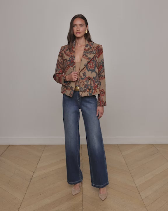 This style debuted at our Fall ‘25 NYFW presentation. Tailored from a luxurious Italian tapestry style wool-blend and woven with an oversized paisley jacquard pattern, the Kelsey cropped peacoat provides sophisticated warmth. Oversized lapels and antique-inspired buttons add vintage charm.