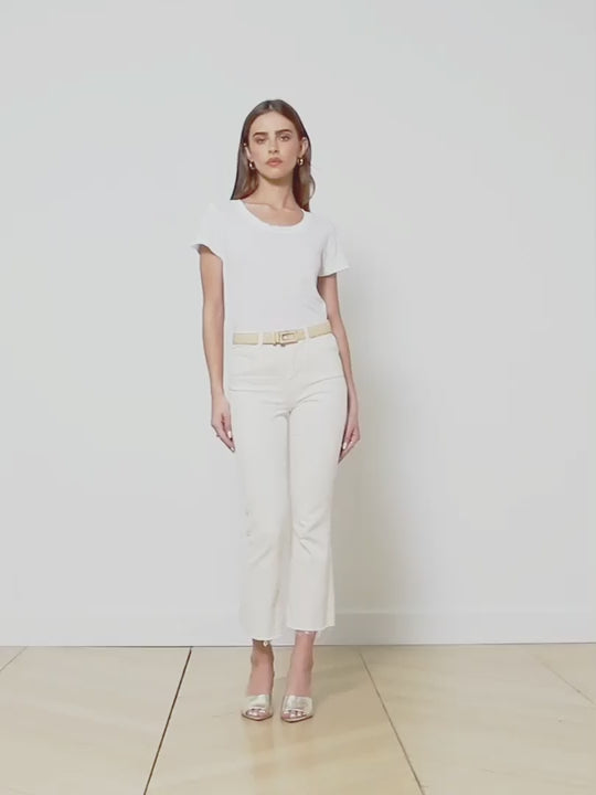 A high-rise cropped flare jean in a premium stretch denim and vintage-white hue. Style hugs from waistband to knee before extending into a flared cropped leg finished with a clean raw hem. Includes five-pocket construction and front zip fly closure.