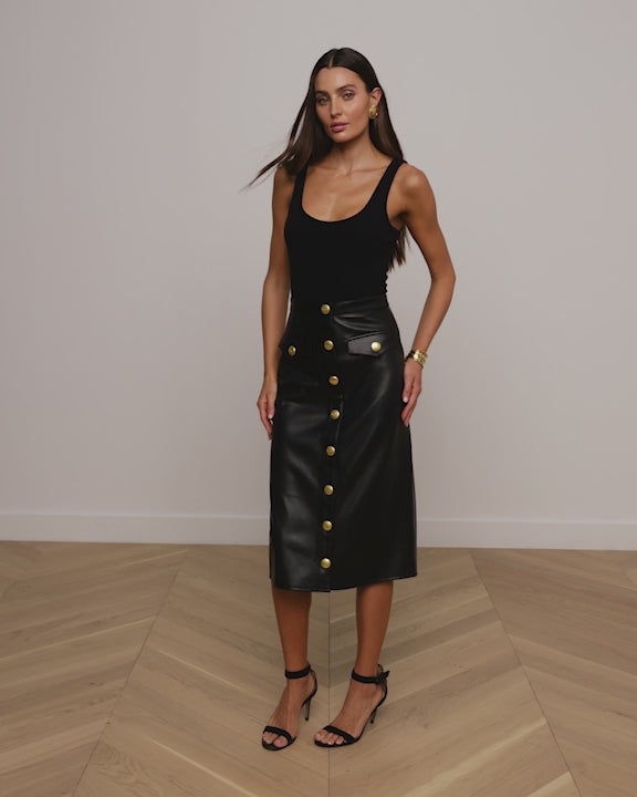 The Milann Vegan Leather Skirt is a high-waisted black pencil skirt with a front button-down closure, large gold buttons, and two front flap pockets accented with gold buttons.