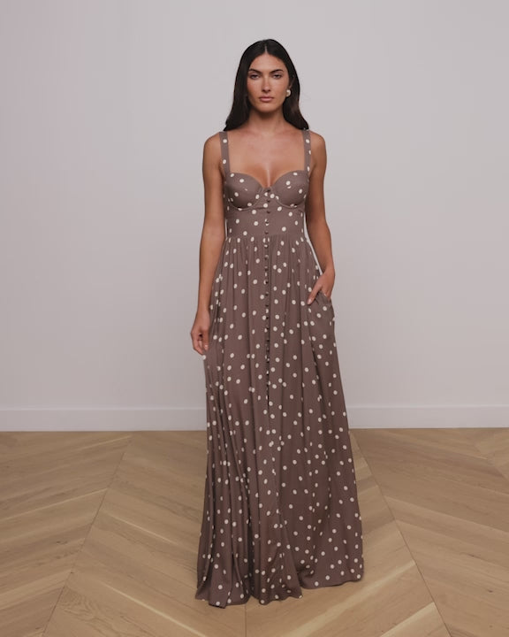 Rosette Maxi Dress: Brown sleeveless summer maxi with white polka dots, fitted sweetheart bodice, wide shoulder straps, and a pleated flowing skirt.