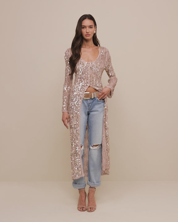 If destination summer were a top, it would look like the Taline. Exquisitely crocheted—entirely by hand—this sequined statement is what to wear for nights that roll into days.