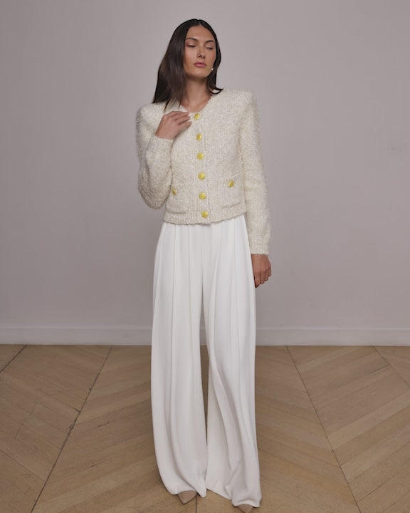 The Una cardigan blends texture and structure in a tailored silhouette. Designed in a soft eyelash knit, it features bold gold buttons, patch pockets, and a round neckline for a polished finish. Its metallic yarns add dimension and depth, perfect for pairing with denim or layered over sleek basics. Wear it as a top or second layer all season long. Now in white with subtle gold threads.