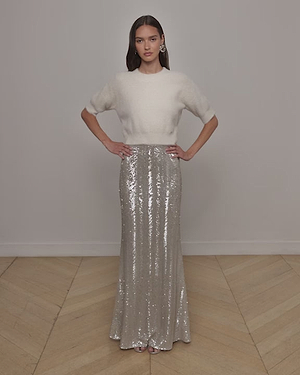 This style was featured in our Fall ‘25 NYFW presentation. The Zeta maxi skirt is a true L’AGENCE icon and all-season bestseller. Versatile, chic, and minimalist in its silhouette, she’s now back with a glamorous update—allover tonal sequins in a soft swirl pattern.