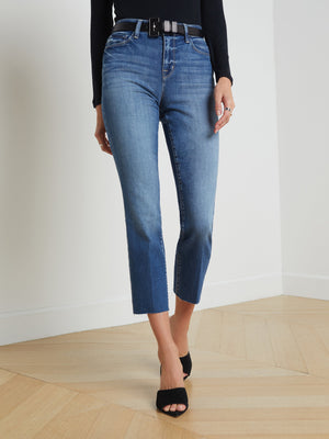 An indispensable high-rise cropped jean in medium blue premium stretch denim with meticulous sanding on hip, thigh, and seat for an authentic weathered look. With classic five-pocket construction, style also includes slim straight leg finished with clean raw hem. Zip fly closure.