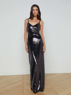 Make an entrance with the Karma. A sexy, structured bodice meets bold black sequins for a body-skimming statement.