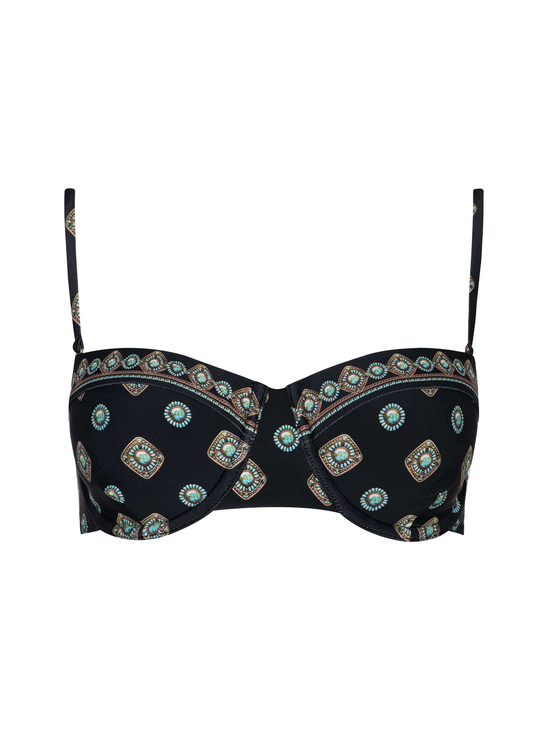 The Alexandria Bikini Top is a black balconette with thin adjustable straps and underwire, featuring a geometric medallion print in turquoise and brown circular patterns.