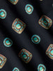 A close-up of the Alexandria Bikini Top’s black fabric, adorned with teal and gold geometric medallion print in alternating round and square motifs, each bordered decoratively with intricate teal details for a textured look.