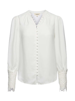 Un chemisier sublimement chic en ivoire. Comprend une fermeture de boucle de self-button inspirée de vintage et des poignets étendus effectués dans une dentelle de guipure festonée exquise. Une silhouette high-basse détendue s'est rassemblée dans le col de bande. Manches longues avec des capuchons plissés. Fermeture du bouton avant.