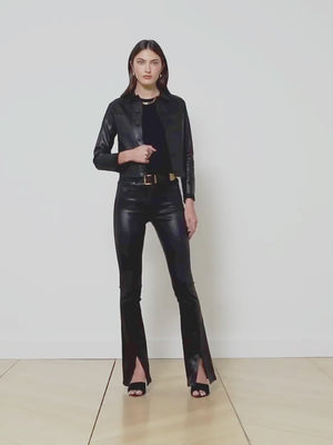 Une veste de denim enrobée mince et subtilement brillante en noir saturé. Une couture coupée, une couture à angle avant et des poches de welt définissent la taille, accentuant une forme de sablier. Comprend des ourlets avec des bords bruts propres, des poches thoraciques à double creux et des manchons à trois quarts à menace. Se fixer à l'avant avec des boutons mat-noir.