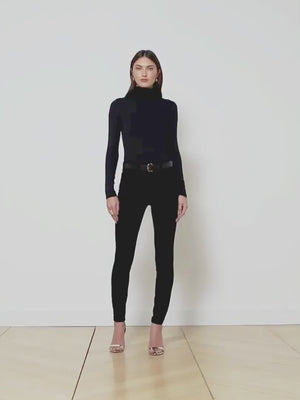 Un col roulé noir intemporel avec des manches pleine longueur obtient une brillance subtile et une finition lisse à partir d'une fabrication de microfibres de luxe. L'ajustement slim complimente le denim et est idéal pour la superposition.
