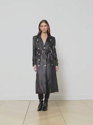 Un classico trench a doppio petto in pelle nera. Con una mano elastica e burrosa, in stile cuoio premium in pelle dalla spalla forte alla vita, quindi drappeggi in una silhouette a linea per l'orlo. Include la manica a doppio cintura con rivestimento con cerniera, tasche a gambero piegate, pulsanti di accento a cupola in rilievo dorato e cintura di fibbia staccabile. Chiusura a scatto anteriore. Completamente foderato.