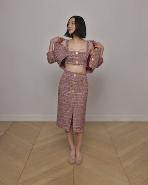 Una classica gonna a matita reinventata tweed colorata. Terminata con pulsanti dorati e un delicato rivestimento marginale, il tai canali di smalto senza tempo con un tocco giocoso.