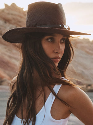 Incontra Adilah, una fedora ampia versa creata con una cinghia in pelle impreziosita da conchos argento e turchese.