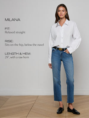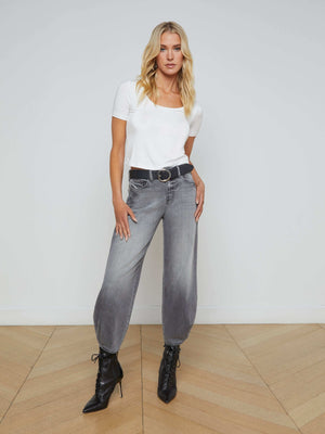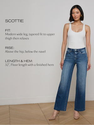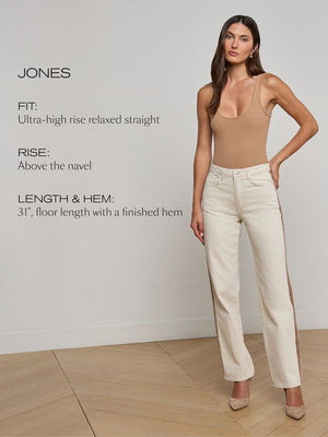 A partire dall'orlo inferiore del jeans, misura dalla cucitura sinistra alla cucitura destra