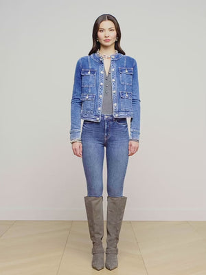 Una giacca classica senza colletto in denim premium medio-blu con invecchiamento sottile. La lavorazione meticolosa ha fatto eco in bordi fasciati cuciti a contrasto e tasche a pattina. La vita sottilmente forma crea una silhouette lusinghiera. Con pulsanti di accento a cupola in rilievo d'argento. Nessuna chiusura.