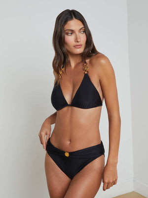 우리의 클래식 블랙 삼각형 비키니 탑은 이제 미묘한 매력의 힌트를 위해 골드 코인 하드웨어로 업데이트되었습니다.