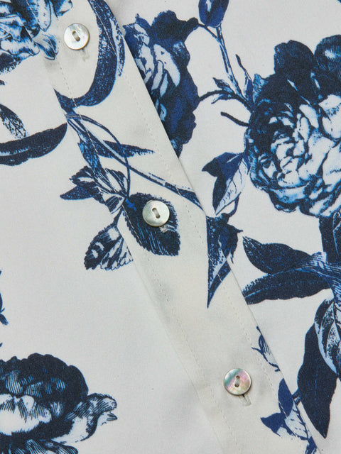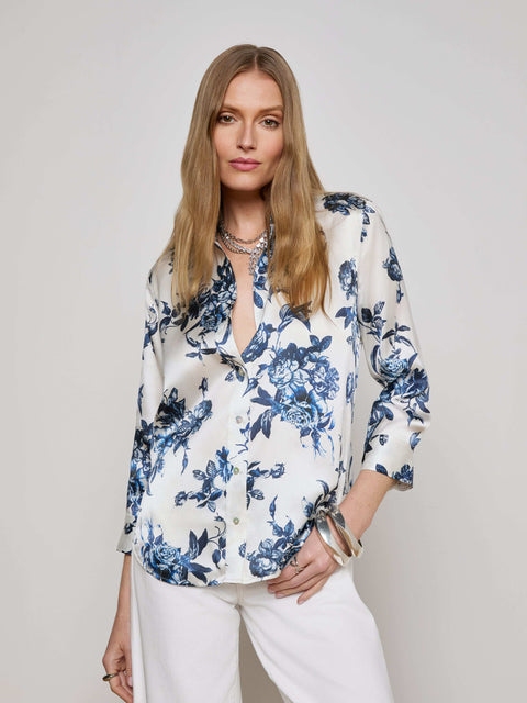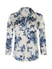 라장스의 아이코닉한 실크 버튼다운 블라우스. 시그니처 7부 슬리브 디자인과 블루 플로럴 프린트가 어우러져 세련된 무드를 선사합니다.