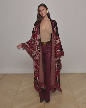 2025년 가을 뉴욕 패션위크에서 선보인 나오코. 대담한 스케일과 정교한 디테일이 돋보이는 폰초로, 어떤 룩에도 감각적인 존재감을 드러냅니다. 태피스트리에서 영감을 받은 자카드에 오버사이즈 페이즐리 모티프를 담아내고, 풍성한 프린지가 텍스처를 더합니다. 오픈 프론트 디자인이 자연스럽게 흐르듯 떨어지며, 빈티지한 매력과 자유로운 무드를 동시에 담아냅니다.