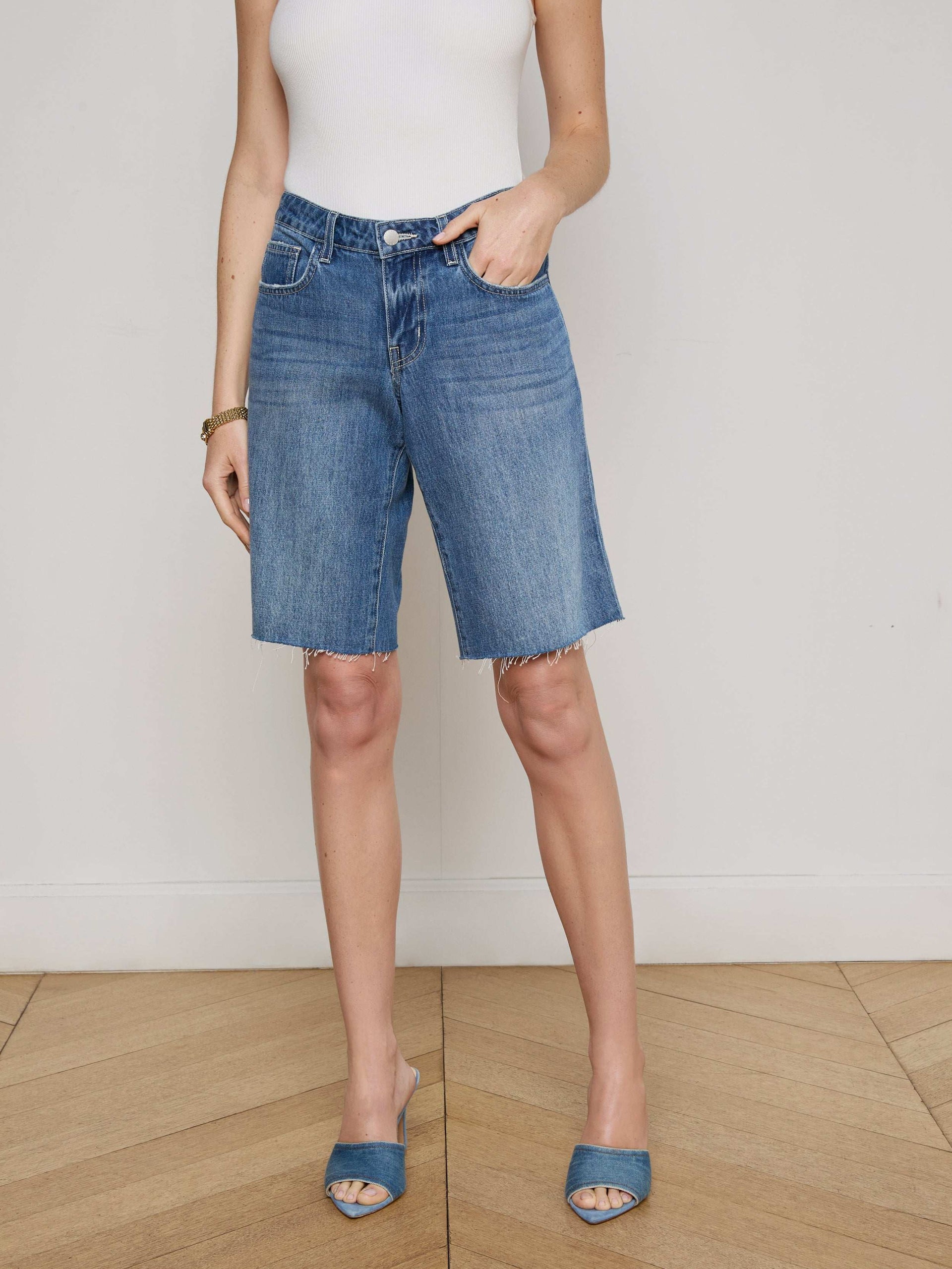 Your coolest Bermuda denim short is the low-rise Elise. This style sits at the hip and features a relaxed fit that hits just above the knee. Now in a medium wash.