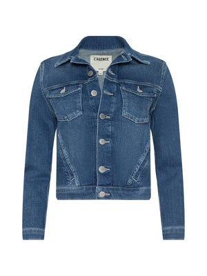 Our signature three-quarter sleeve jean jacket is back with a finished hem in a clean medium wash. Angled seams and pockets add flattering definition to the waist. We love wearing the Maven as a top or layered over a favorite tee.