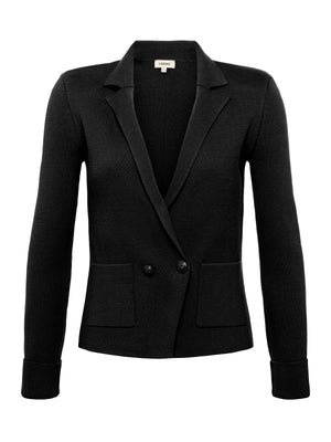 A double-breasted blazer in black premium knit. Tapered at the waist, supple, feminine style is balanced by smart tailored touches like strong shoulders, sleek lapels and patch pockets. Embossed-dome buttons add a luxe finish.