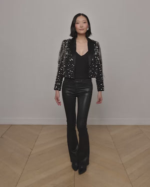 Constructed with hand-embellished crystals, silver chain fringe, and a satin lapel, the Soma delivers big on high-impact glamour. Layer it over a gown for your next event or wear it with a bodysuit and distressed jeans for unexpectedly sophisticated spin on the everyday look.