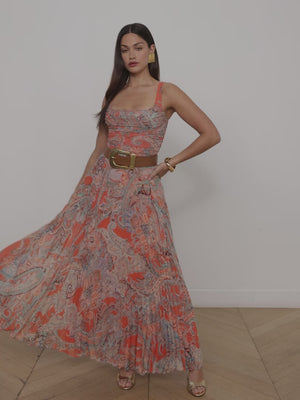 The Torin is a pleated maxi skirt that showcases a flowing silhouette and traditional paisley print in sun-washed tones. Designed for easy movement and all-day comfort, it’s a go-to for effortless style.