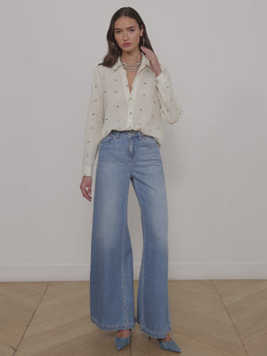 The Laurent is our relaxed fit long sleeve button-down, now in a textured off-white cotton with beautiful blue floral embroidery.